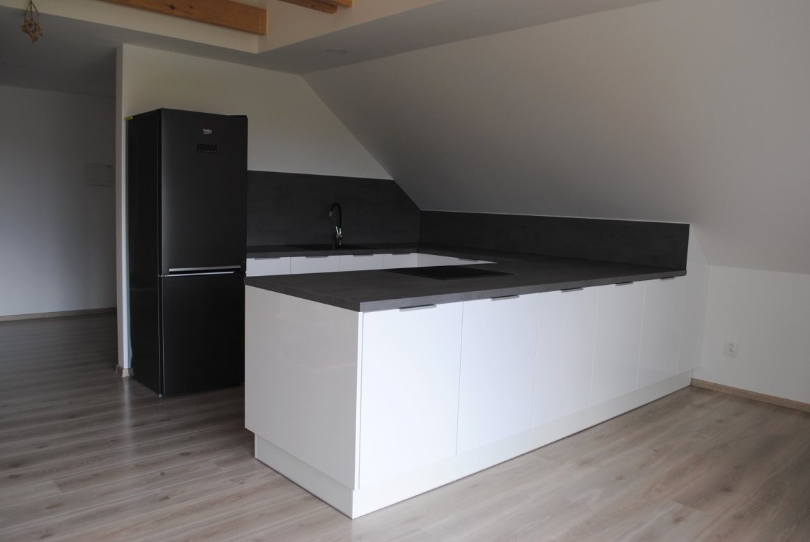 Kuchyňská linka - korpus bílá, dvířka Bílá vysoký lesk, pracovní desky Egger Chromix Antracit. Místo realizace - Kunčičky u Bašky